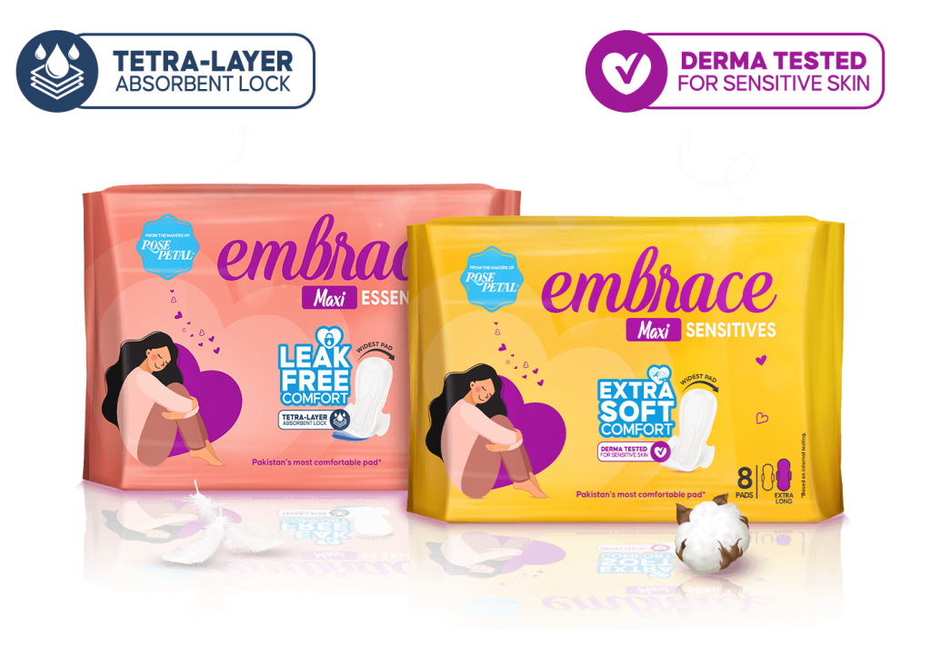 Embrace has introduced Pakistan’s first ever Sensitives sanitary napkin range particularly designed for rash & allergy-prone skins and an Essentials range that offers unparalleled absorption capacity for regular use. We believe it’s time to be comfortably ‘woman’ in a world where menstruation is still a topic talked about in hushed tones, where periods are still a taboo, and women still hesitate to Embrace their bodies.